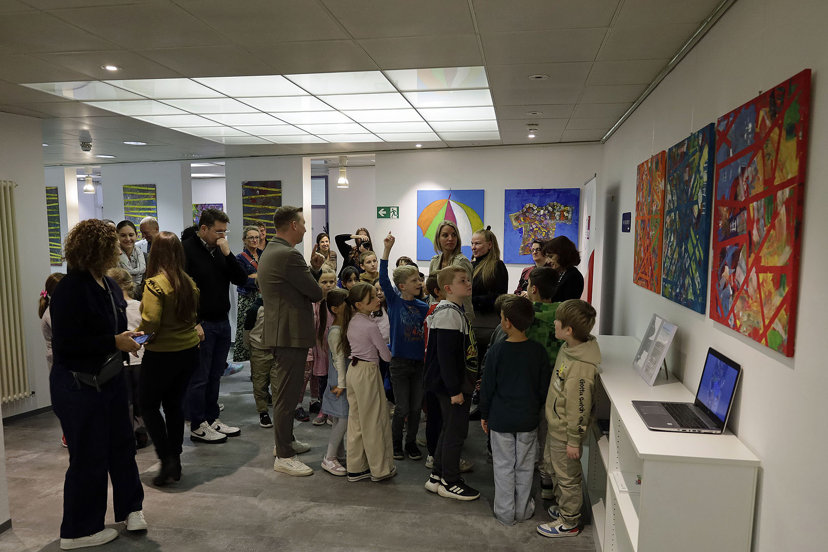 Sascha Haas, MdL, begrüßte mehr als 40 Kinder im Fraktionsaal und stellte sich auch ihren Fragen. Auch der Kinderschutzbeauftragte des Saarlandes Kai Frisch, der Vorstand des Kinderschutzbundes Ortsverband e.V. Saarbrücken, Diana Kleinbauer- Nau und die Künstlerin freuten sich über die lebhaften Kinderfragen.